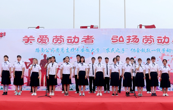 “五一”國際勞動節(jié)當(dāng)天,路面公司團(tuán)總支攜手安徽大學(xué)“農(nóng)民之子”公益社團(tuán),在舒城G206路面項目成功舉辦了“關(guān)愛勞動者,弘揚(yáng)勞動美”主題義演活動,向堅守施工一線的勞動者致以美好的節(jié)日祝福。舒城交通局局長許教育,黨組副書記何詩敖,交通局質(zhì)監(jiān)站站長許令友親臨義演現(xiàn)場觀看。近八十余名一線勞動者現(xiàn)場觀看了演出。