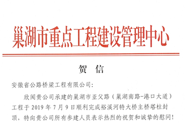 近日,巢湖市重點(diǎn)工程建設(shè)管理中心向公司發(fā)來賀信,對公司承建的巢湖市亞父路(巢湖南路-港口大道)工程在7月9日順利完成裕溪河特大橋主橋塔柱封頂表示熱烈祝賀和誠摯慰問。