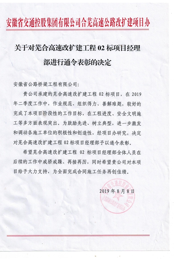 近日,合蕪02標(biāo)收到來(lái)自項(xiàng)目辦簽發(fā)的通令表彰文件,對(duì)項(xiàng)目在二季度較好完成階段性工作目標(biāo)給予肯定,對(duì)項(xiàng)目工程進(jìn)度、安全文明施工等方面取得的突出成績(jī)表示贊揚(yáng)。