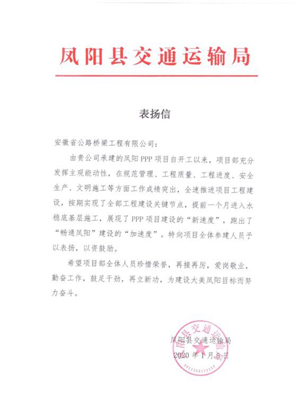 近日,鳳陽縣交通運(yùn)輸局給公司投資建設(shè)的鳳陽PPP項(xiàng)目發(fā)來表揚(yáng)信,對項(xiàng)目自開工以來全速推進(jìn)工程建設(shè),按期實(shí)現(xiàn)關(guān)鍵節(jié)點(diǎn)目標(biāo),以及在規(guī)范管理、工程質(zhì)量、安全生產(chǎn)等方面所取得的成績給予了贊揚(yáng)。