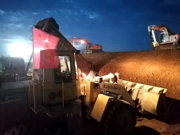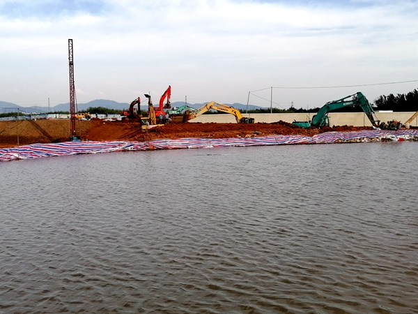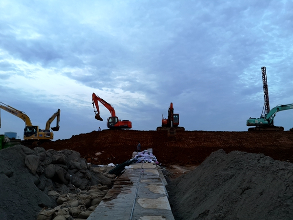 巢湖市東外壞旗山撇洪溝,位于巢湖鼓山腳下,連接清溪河支流,連日降雨,清溪河水位暴漲,防汛壓力巨大,經(jīng)開區(qū)的人民生命和財(cái)產(chǎn)安全受到嚴(yán)重威脅。經(jīng)巢湖市政府研究決定,在旗山撇洪溝和清溪河支流交匯處筑壩,將撇洪溝東側(cè)低洼處作為清溪河支流泄洪預(yù)備區(qū),以應(yīng)對(duì)清溪河水位暴漲危險(xiǎn)。接到汛情指令,巢湖市亞父路項(xiàng)目部迅速出動(dòng),組建防汛突擊隊(duì),調(diào)集挖掘機(jī)、裝載機(jī)等機(jī)械設(shè)備迅速奔赴搶險(xiǎn)一線,連續(xù)奮戰(zhàn)兩天三夜,填筑黃土近10000方,碎石1500方,拋石700噸,圓滿完成了底寬22米,上寬10米,高5米,長(zhǎng)110米的筑壩任務(wù),確保了經(jīng)開區(qū)的人民生命和財(cái)產(chǎn)安全。