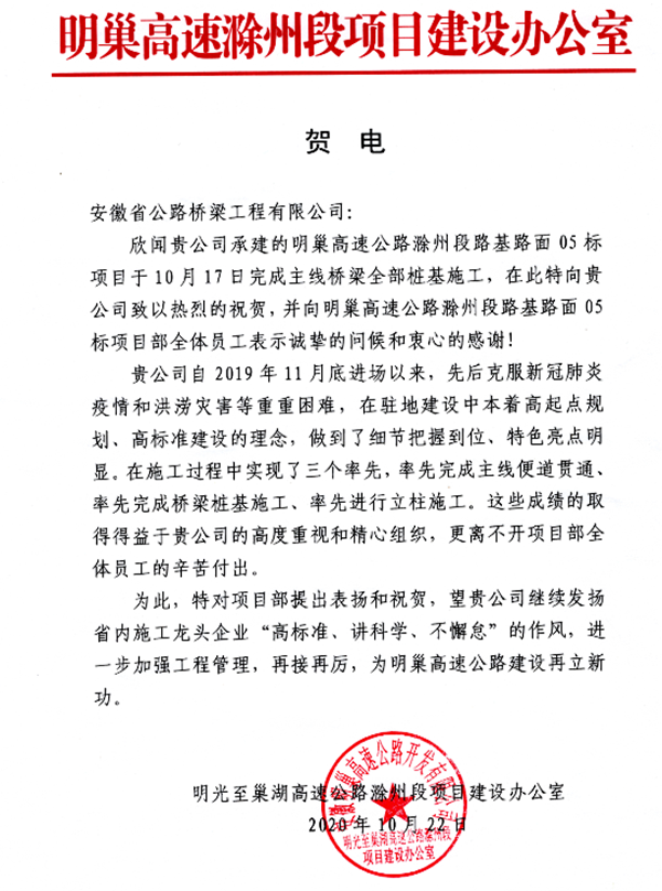 近日,明巢高速滁州段項目辦發(fā)來賀電,對公司承建的明巢高速路基路面05標項目完成主線橋梁全部樁基施工任務(wù)表示祝賀,并向全體參建人員表示感謝。