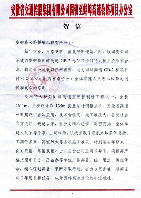 農(nóng)歷牛年伊始,公司承建的固蚌高速2標項目收到業(yè)主發(fā)來的賀信,對項目春節(jié)期間穩(wěn)工穩(wěn)產(chǎn),如期完成澮河特大橋主橋合龍表示祝賀。