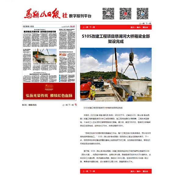 近日,公司承建的馬鞍山市S105改建工程項目慈湖河大橋箱梁全部架設完成,得到了馬鞍山電視臺、馬鞍山日報等當?shù)刂髁髅襟w的重點關注。