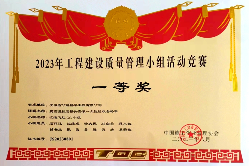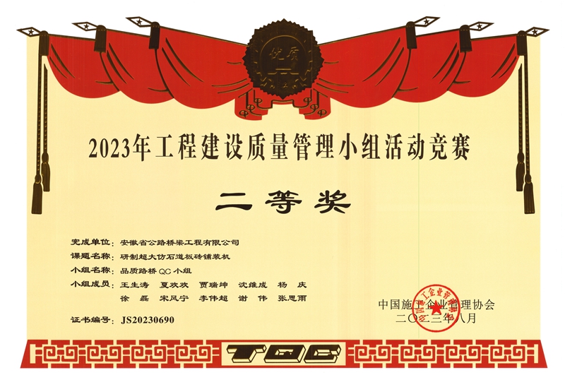 8月11日,中國施工企業(yè)管理協(xié)會“2023年(首屆)工程建設(shè)行業(yè)質(zhì)量管理小組活動高質(zhì)量發(fā)展大會”在山西太原順利閉幕。會議對各地區(qū)及行業(yè)協(xié)會推薦的1468個優(yōu)秀QC成果進(jìn)行了集中發(fā)布,其中橋梁分公司申報的QC成果《提高溫控管接頭安裝一次性驗收合格率》榮獲一等獎,市政分公司申報的QC成果《提高地下車庫地坪施工合格率》《研制超大仿石道板磚鋪裝機(jī)》榮獲二等獎。