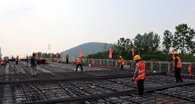 小蜀山東路上跨橋是項目控制性施工節(jié)點(diǎn)。施工現(xiàn)場車流量大、重型貨車多且新建道路與既有道路存在較大高差導(dǎo)致交通組織極其困難,小蜀山東路南側(cè)房屋未拆遷,現(xiàn)場幾乎無施工作業(yè)面。面對重重困難,為保障此節(jié)點(diǎn)順利完成,項目部提前謀劃,多次組織相關(guān)單位召開方案研討會,優(yōu)化施工方案,并通過科學(xué)組織施工,前后組織十余次交通導(dǎo)改,巧妙利用南幅新建橋梁作為施工便道和作業(yè)面,歷時45天順利實現(xiàn)全線首座上跨橋雙幅貫通。
