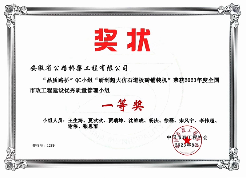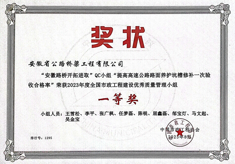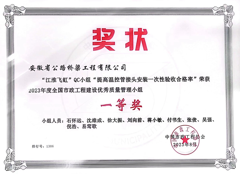 11月10日,中國市政工程協(xié)會“2023年全國市政工程建設質(zhì)量管理小組培訓交流會”在廣東佛山順利召開,會上頒發(fā)了2023年度全國市政工程建設優(yōu)秀質(zhì)量管理小組各分組成績排名第一的QC成果證書,公司3項成果名列其中。