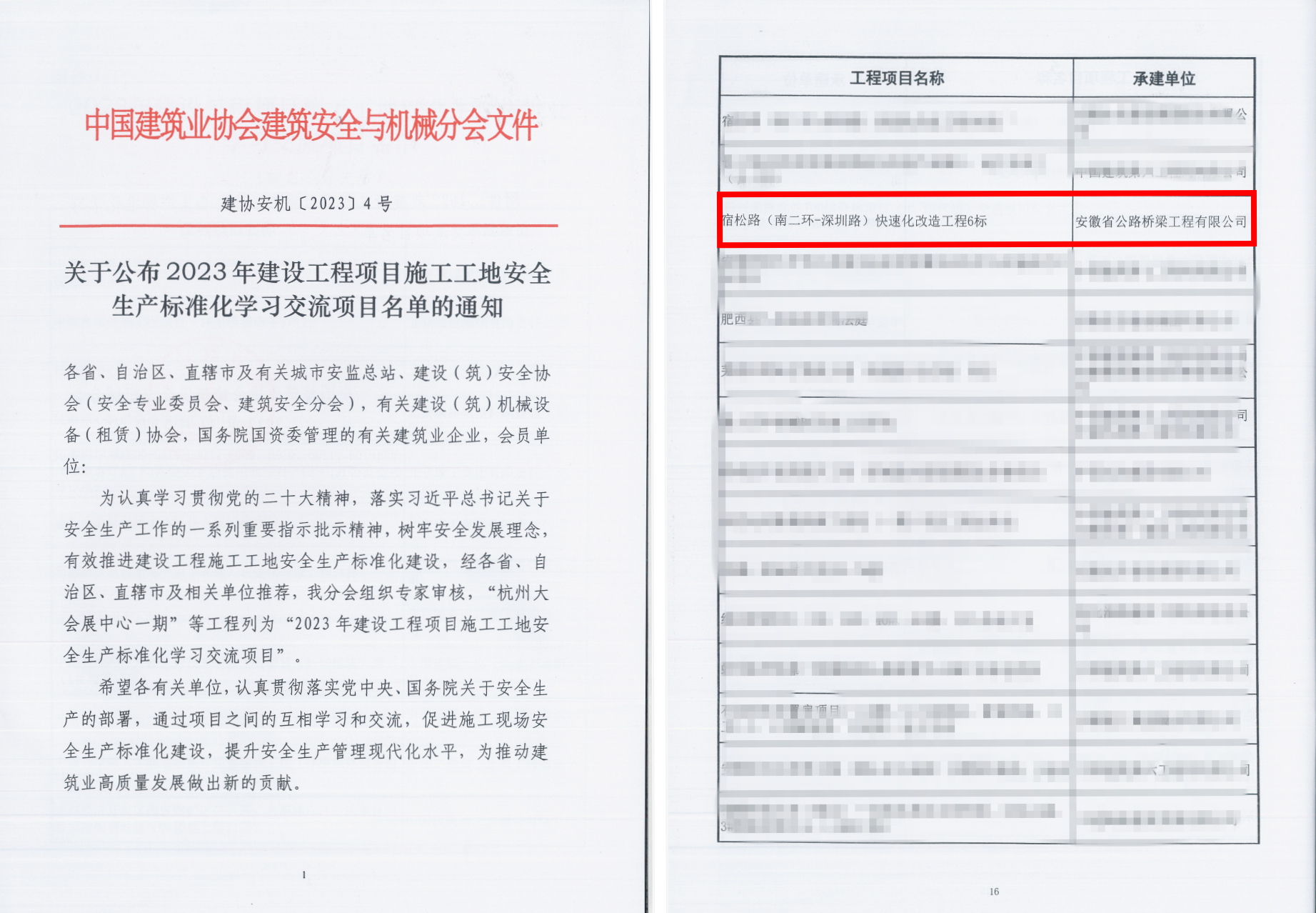 近日,中國(guó)建筑業(yè)協(xié)會(huì)公布2023年建設(shè)工程項(xiàng)目施工工地安全生產(chǎn)標(biāo)準(zhǔn)化學(xué)習(xí)交流項(xiàng)目(原全國(guó)AAA安全文明標(biāo)準(zhǔn)化工地)名單,公司承建的宿松路(南二環(huán)-深圳路)快速化改造工程6標(biāo)段榜上有名。