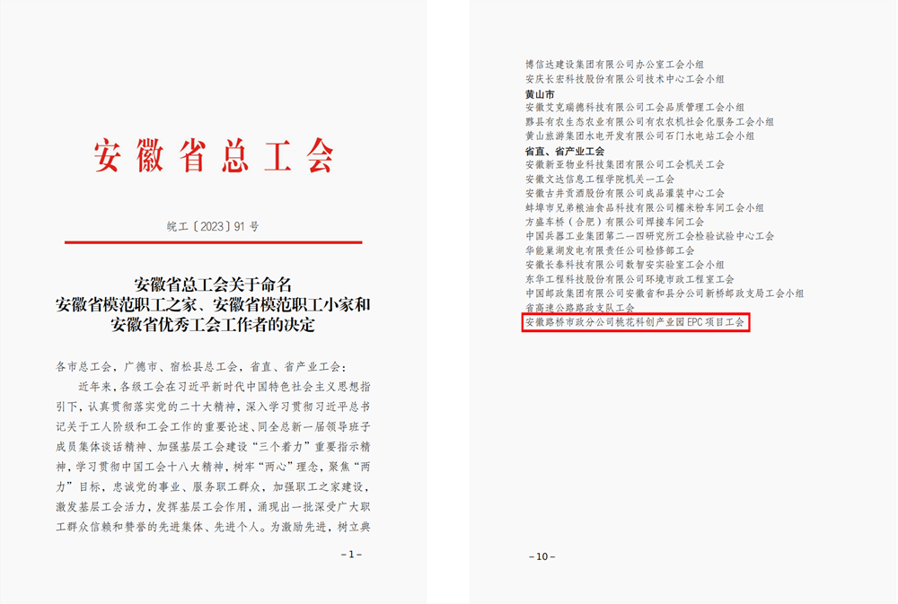 近日,安徽省總工會公布《安徽省總工會關(guān)于命名安徽省模范職工之家、安徽省模范職工小家和安徽省優(yōu)秀工會工作者的決定》,桃花科創(chuàng)產(chǎn)業(yè)園EPC項(xiàng)目工會榮獲“安徽省模范職工小家”榮譽(yù)稱號。