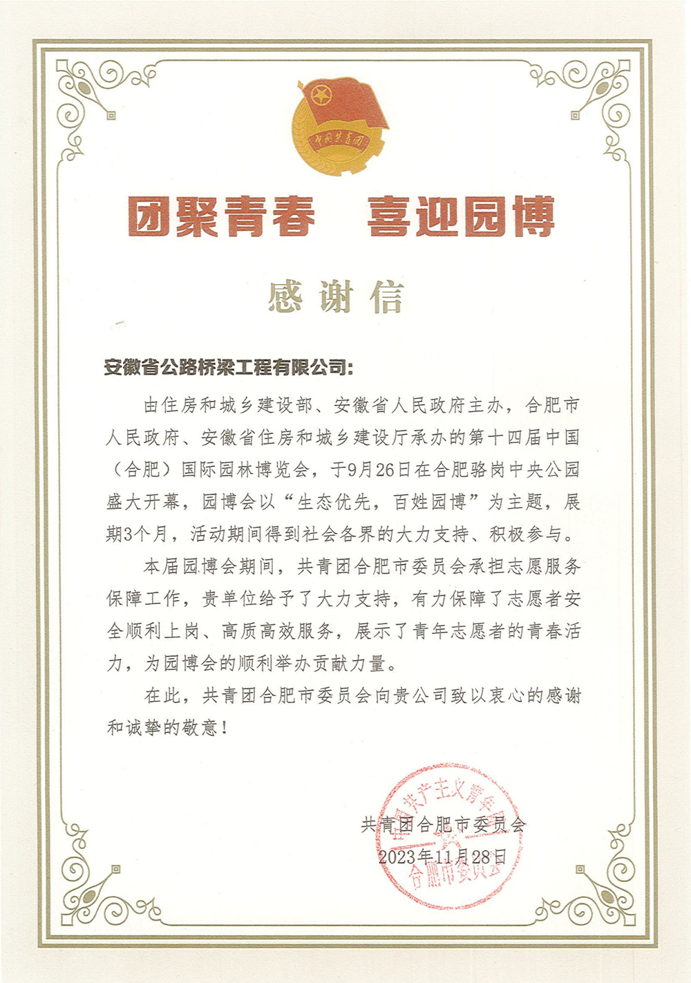 2023年5月至9月,公司集聚優(yōu)勢資源,承建園博園機(jī)場跑道修復(fù)及相關(guān)配套項(xiàng)目,高效完成各項(xiàng)施工任務(wù),為老機(jī)場跑道換上“新衣”,助力園博盛會(huì)精彩開幕。同時(shí),在園博會(huì)期間,積極響應(yīng)合肥團(tuán)市委號(hào)召,組織招募青年志愿者,為園博會(huì)期間的各項(xiàng)活動(dòng)做好服務(wù)保障工作,展現(xiàn)了新時(shí)期安徽路橋青年志愿者的風(fēng)采。