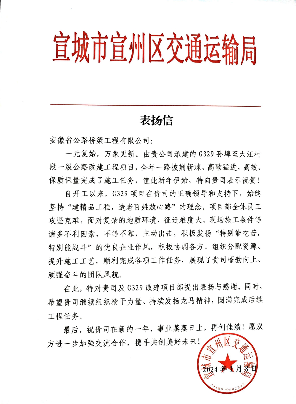 宣城市宣州區(qū)交通運(yùn)輸局來信指出,G329孫埠至大汪村段一級(jí)公路改建工程項(xiàng)目始終堅(jiān)持“建精品工程,造百姓放心路”的理念,克服地質(zhì)環(huán)境復(fù)雜、征遷難度大、施工條件差等諸多不利因素,積極協(xié)調(diào)各方,順利完成各項(xiàng)工作任務(wù),展現(xiàn)了項(xiàng)目團(tuán)隊(duì)頑強(qiáng)奮斗的精神風(fēng)貌。