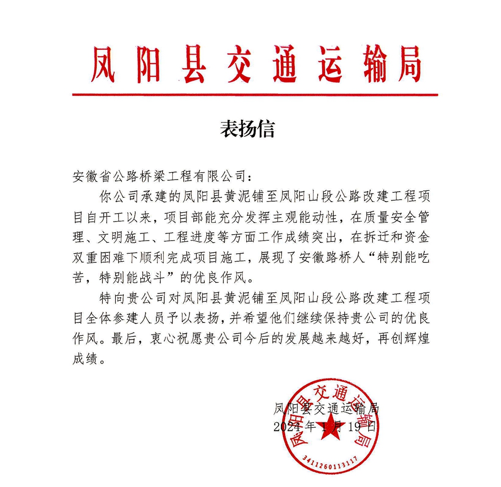 鳳陽縣交通運(yùn)輸局來信表示,鳳臺(tái)縣黃鳳公路改建工程項(xiàng)目團(tuán)隊(duì)發(fā)揮主觀能動(dòng)性,在質(zhì)量安全管理、文明施工、工程進(jìn)度等方面工作成績突出,充分發(fā)揚(yáng)了安徽路橋“特別能吃苦、特別能戰(zhàn)斗”的企業(yè)作風(fēng)。