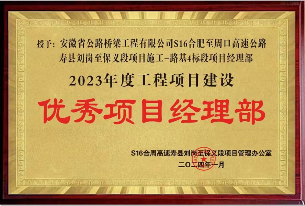 淮南交控(集團(tuán))有限公司S16合周高速壽縣劉崗至保義段項(xiàng)目辦發(fā)布2023年度“五比五看”評(píng)比得分通報(bào),公司承建的S16合周高速4標(biāo)東淝河大橋項(xiàng)目在全線脫穎而出,位列年度綜合考評(píng)第一名,獲通報(bào)表揚(yáng),并被授予“優(yōu)秀項(xiàng)目經(jīng)理部”榮譽(yù)稱號(hào)。