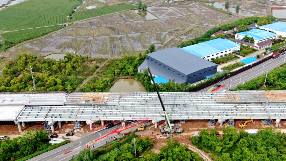 S330分離立交橋總長(zhǎng)543米,其中鋼板組合梁長(zhǎng)185米,上跨S330省道,采用節(jié)段吊裝施工方案,共分100個(gè)節(jié)段。自3月15日首片鋼板組合梁吊裝以來(lái),項(xiàng)目部克服連續(xù)降雨、車(chē)流量大等不利因素,迎難而上,精心組織,安全穩(wěn)步推進(jìn)梁板架設(shè)工作,歷經(jīng)35天完成全部鋼板組合梁吊裝。