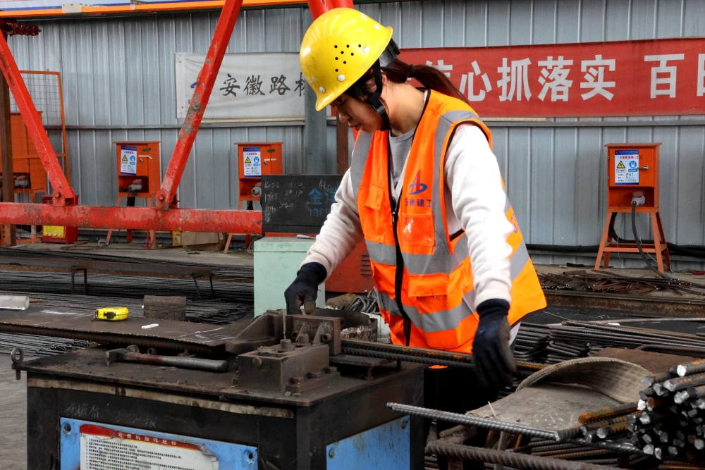 在G329改建工程項(xiàng)目預(yù)制梁場(chǎng)的鋼筋加工棚內(nèi),工人正在對(duì)預(yù)制梁所需要的鋼筋進(jìn)行彎曲。目前,該項(xiàng)目橋梁已進(jìn)入橋面系施工階段,路基施工正式進(jìn)入瀝青攤鋪階段。