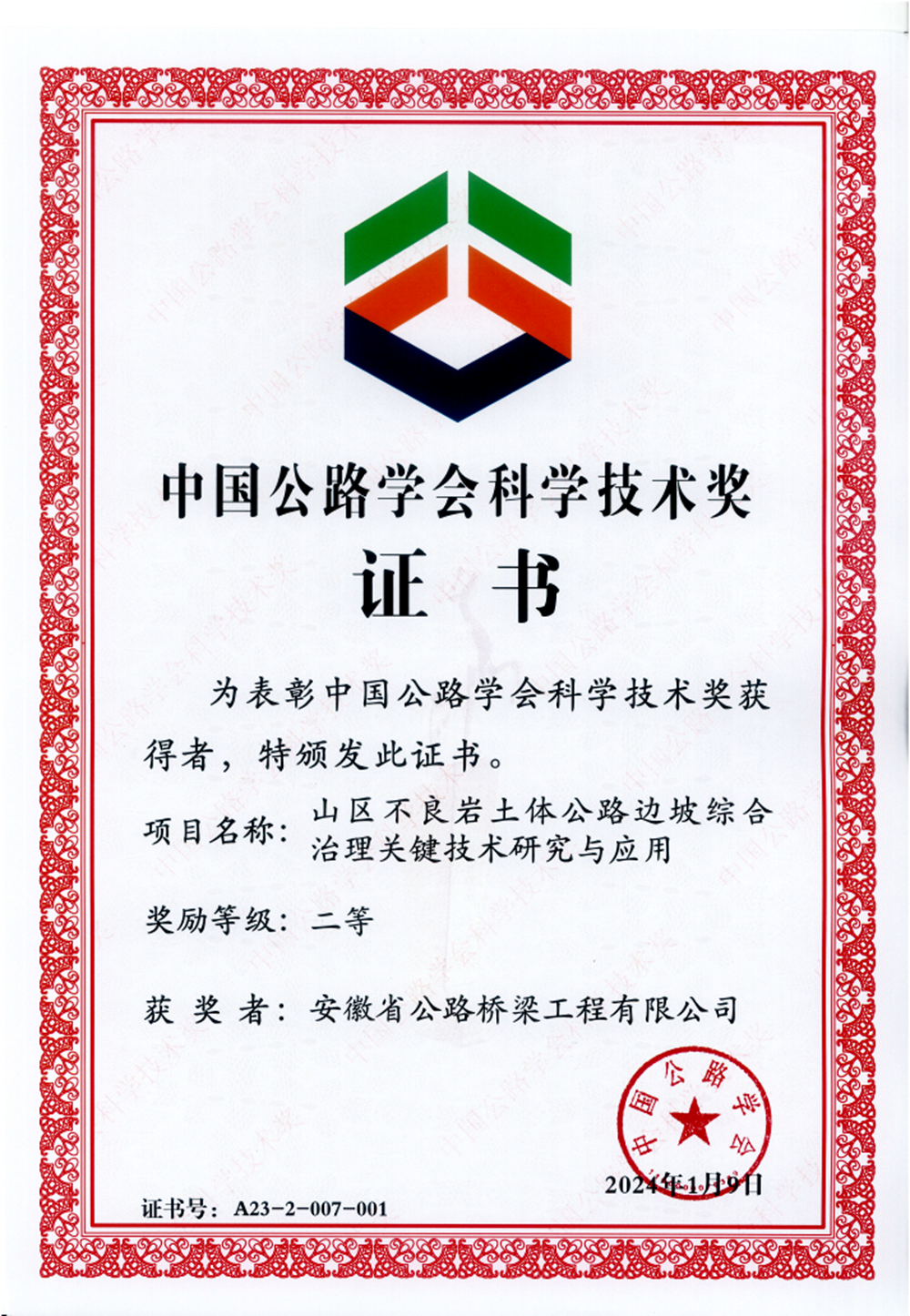 公司榮獲2023年度中國公路學(xué)會科學(xué)技術(shù)二等獎