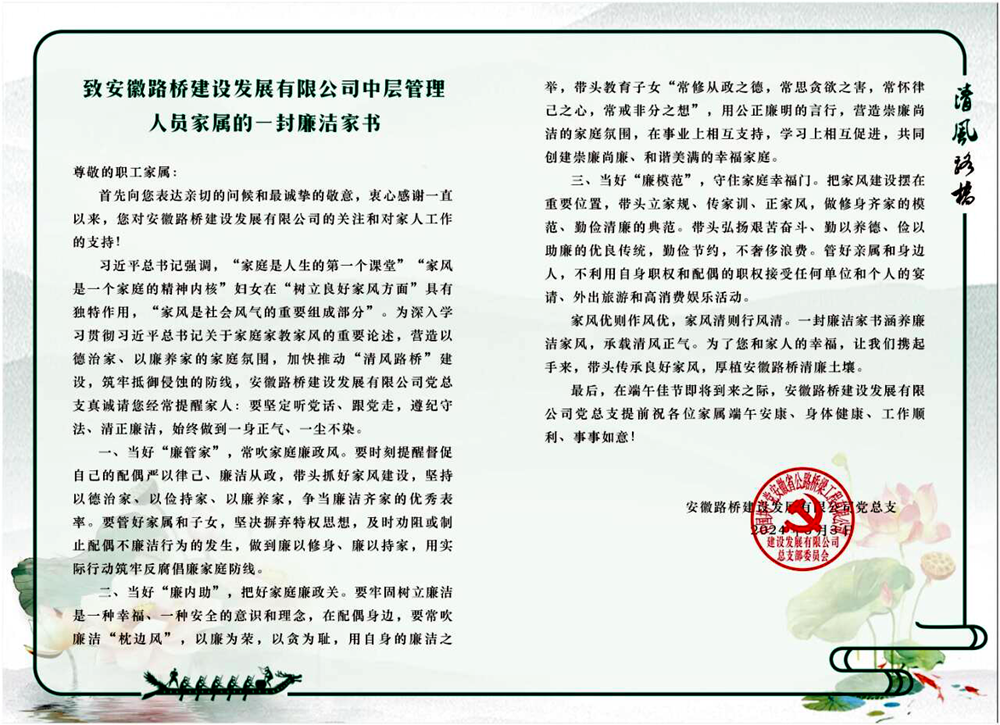 建設(shè)公司深入貫徹落實(shí)集團(tuán)紀(jì)委陽光、清廉、建工“六個一”廉潔文化創(chuàng)建工作部署,積極推進(jìn)“清廉”之家建設(shè)。組織開展“5·10思廉日”活動,為50余名管理人員發(fā)放廉潔家書,進(jìn)一步加強(qiáng)家風(fēng)家教建設(shè),將家庭親情融入職工廉潔教育中;組織參與公司紀(jì)委讀書月讀廉書活動,擇優(yōu)推薦3幅讀廉書作品。組織職工積極參加公司信息化“廉潔知識測試”活動,促進(jìn)黨員干部職工以考促學(xué)、以學(xué)促廉。