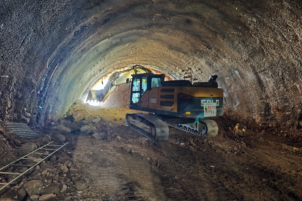 在江梓隧道左洞的內(nèi)部,也同時迎來了激動人心的一刻。隨著挖掘機挖掘產(chǎn)生的巨大轟鳴聲在隧道內(nèi)回蕩,最后一塊巖石被精準地挖掘開來,陽光透過新開的洞口灑進隧道,照亮了這片黑暗的空間。工人們紛紛停下手中的工作,歡呼雀躍,慶祝這一時刻的到來。江梓隧道左洞的順利貫通,為項目后續(xù)耙齒嶺大橋梁板運輸及安裝提供了有力保證,為整體工程的推進奠定了堅實基礎(chǔ)。江梓隧道右洞的施工也在緊張施工中,預(yù)計于8月份貫通。