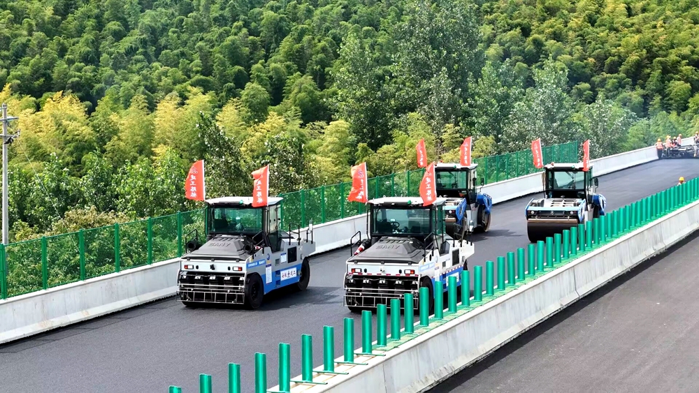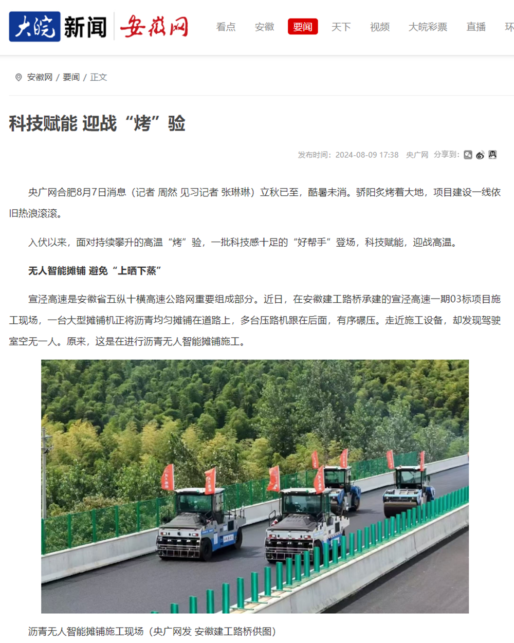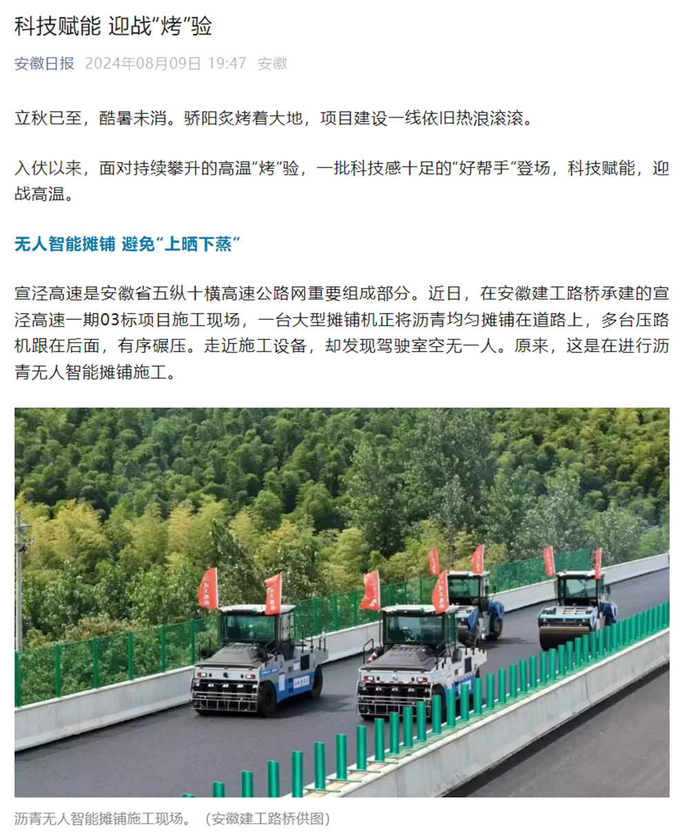 宣涇高速是安徽省五縱十橫高速公路網(wǎng)重要組成部分。近日,在安徽建工路橋承建的宣涇高速一期03標(biāo)項(xiàng)目施工現(xiàn)場,一臺(tái)大型攤鋪機(jī)正將瀝青均勻攤鋪在道路上,多臺(tái)壓路機(jī)跟在后面,有序碾壓。走近施工設(shè)備,卻發(fā)現(xiàn)駕駛室空無一人。原來,這是在進(jìn)行瀝青無人智能攤鋪施工。