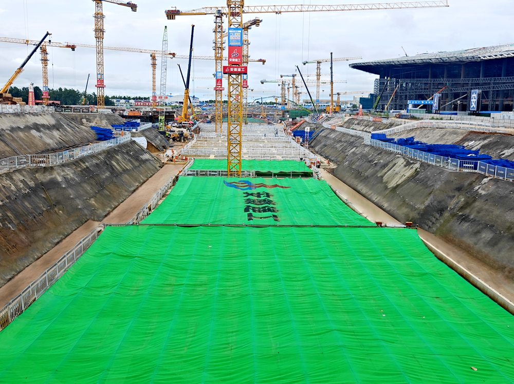 灼灼烈日,人們出行會(huì)打起遮陽傘躲避烈日與紫外線侵襲。近日,在合肥新橋機(jī)場綜合交通中心項(xiàng)目現(xiàn)場,一項(xiàng)防暑“神器”——大跨度、智能化防塵“天幕”系統(tǒng)投入使用,如同給項(xiàng)目基坑罩上了一把“綠色遮陽傘”。