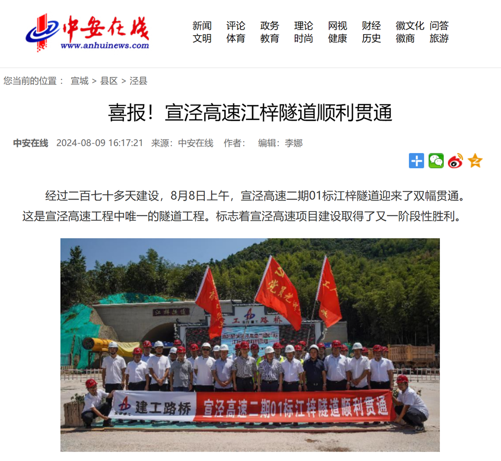 【名媒聚焦】央廣網(wǎng)、中安在線、宣城發(fā)布:宣涇高速二期01標(biāo)江梓隧道順利貫通