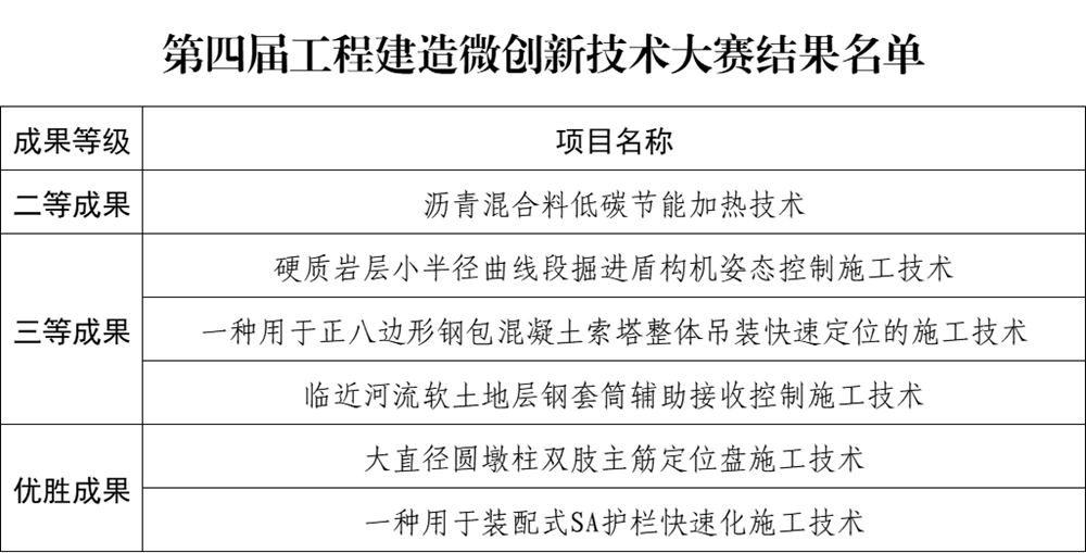 近日,中國(guó)施工企業(yè)管理協(xié)會(huì)公布第四屆工程建造微創(chuàng)新技術(shù)大賽結(jié)果,經(jīng)形式審查、初賽、復(fù)賽、決賽等環(huán)節(jié)的角逐,公司《瀝青混合料低碳節(jié)能加熱技術(shù)》等6個(gè)項(xiàng)目分別榮獲二等成果、三等成果和優(yōu)勝成果。