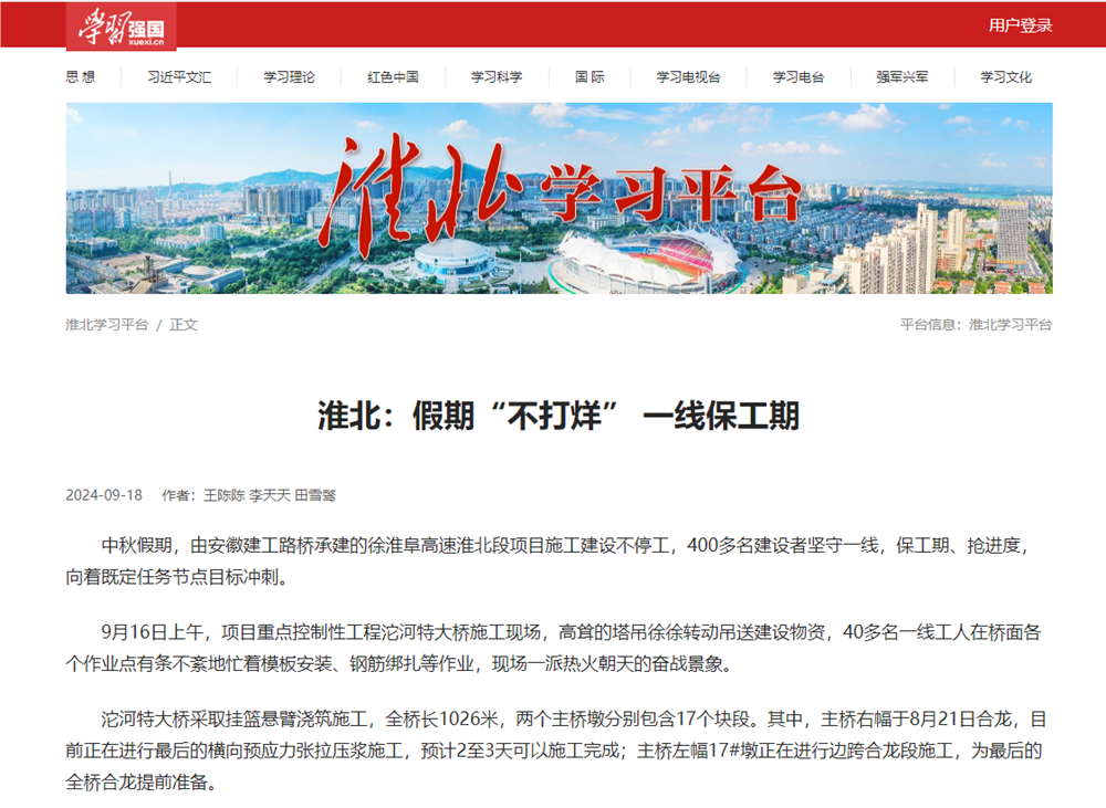 中秋假期,安徽建工路橋建設(shè)者堅守崗位一線,搶抓施工“黃金期”,沖刺節(jié)點目標,跑出實干“加速度”,受到多家主流媒體聚焦報道。