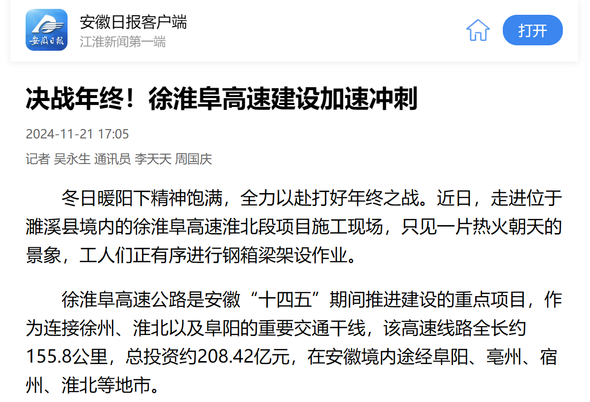 【名媒聚焦】安徽日報客戶端、學(xué)習(xí)強國、淮北日報:決戰(zhàn)年終!徐淮阜高速建設(shè)加速沖刺