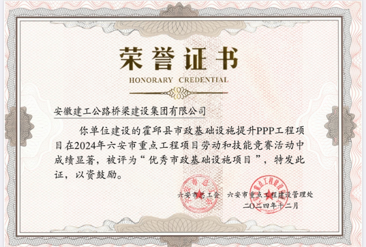 近日,“建功新時代 奮進(jìn)新征程”2024年六安市重點(diǎn)工程項(xiàng)目勞動和技能競賽成果公布,霍邱PPP項(xiàng)目榮獲“優(yōu)秀市政基礎(chǔ)設(shè)施項(xiàng)目”榮譽(yù)稱號。