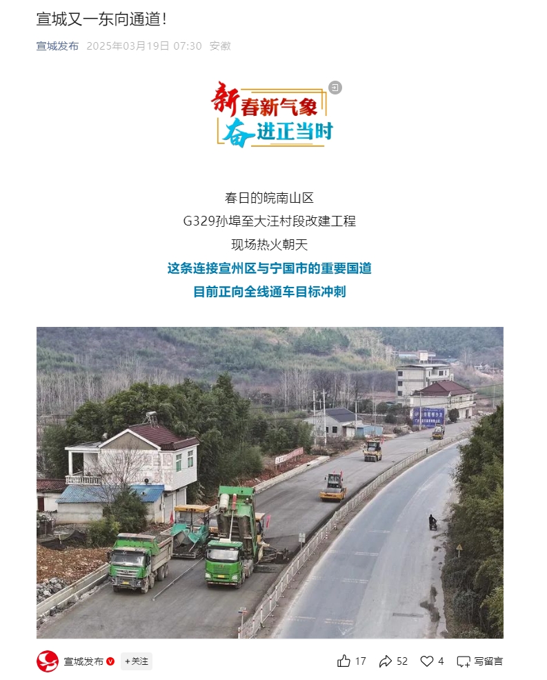 春日的皖南山區(qū),G329孫埠至大汪村段改建工程現(xiàn)場熱火朝天。攤鋪機(jī)、壓路機(jī)與運(yùn)輸車輛轟鳴交織,滾燙的瀝青蒸騰起陣陣白霧。這條連接宣州區(qū)與寧國市的重要國道,目前正向全線通車目標(biāo)沖刺。作為融入長三角的重要通道,項(xiàng)目建成后,宣城至寧國通行時間將大大縮短,惠及沿線10萬余群眾。