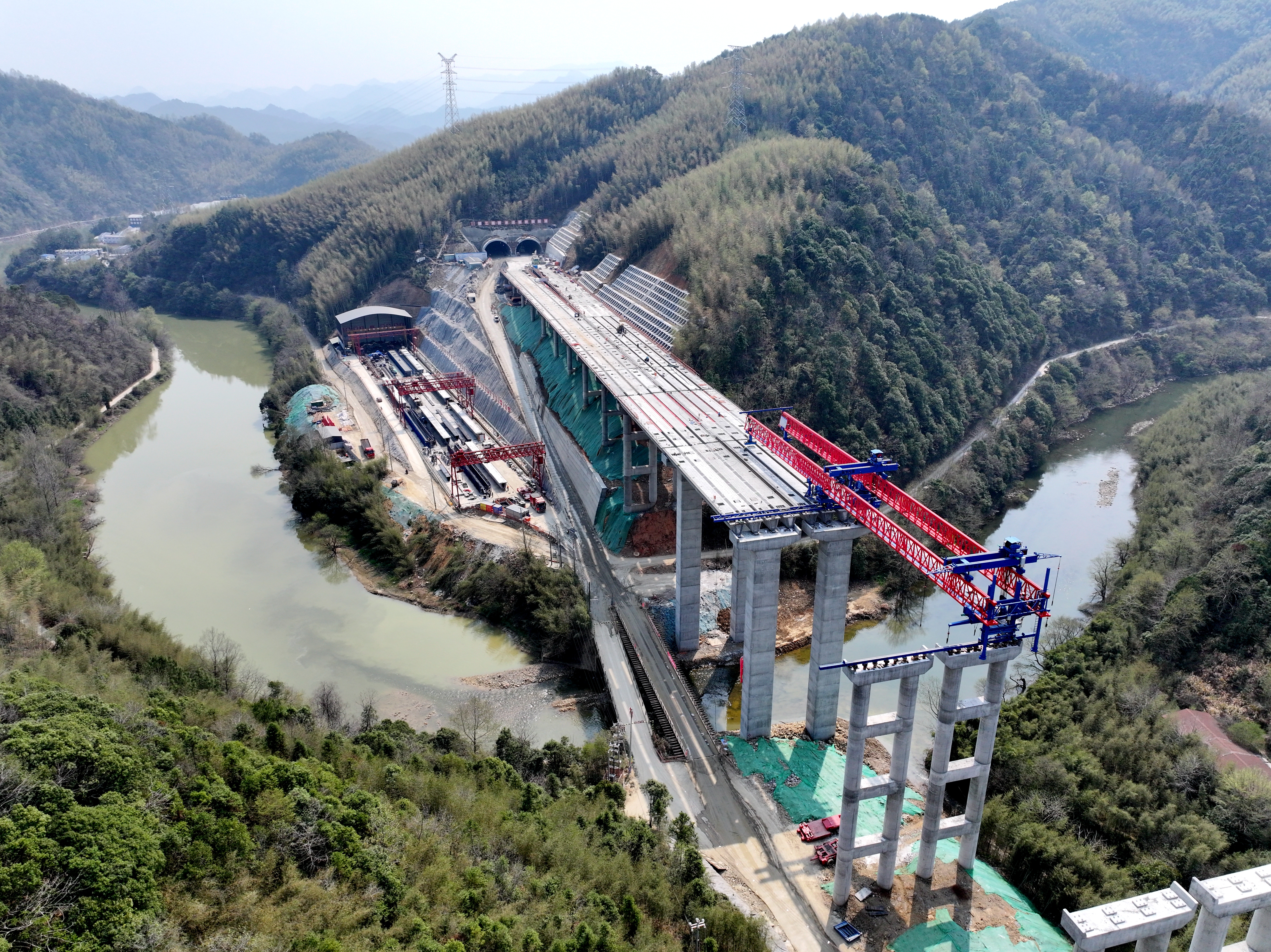 在橋梁施工方面,橫跨浣溪河的特大橋建設(shè)同樣面臨挑戰(zhàn)。為克服12%運梁坡度帶來的困難,項目創(chuàng)新采用“雙主機雙制動運梁炮車”技術(shù),經(jīng)過多次模擬推演,成功實現(xiàn)首片40米箱梁精準架設(shè)。這一突破,標(biāo)志著項目施工從下部結(jié)構(gòu)向上部結(jié)構(gòu)轉(zhuǎn)換,實現(xiàn)橋梁與隧道工序無縫銜接,為后續(xù)架梁作業(yè)奠定基礎(chǔ)。截至目前,項目路基填筑已完成98%,橋梁樁基工程全部完工,梁板預(yù)制架設(shè)進度突破55%。