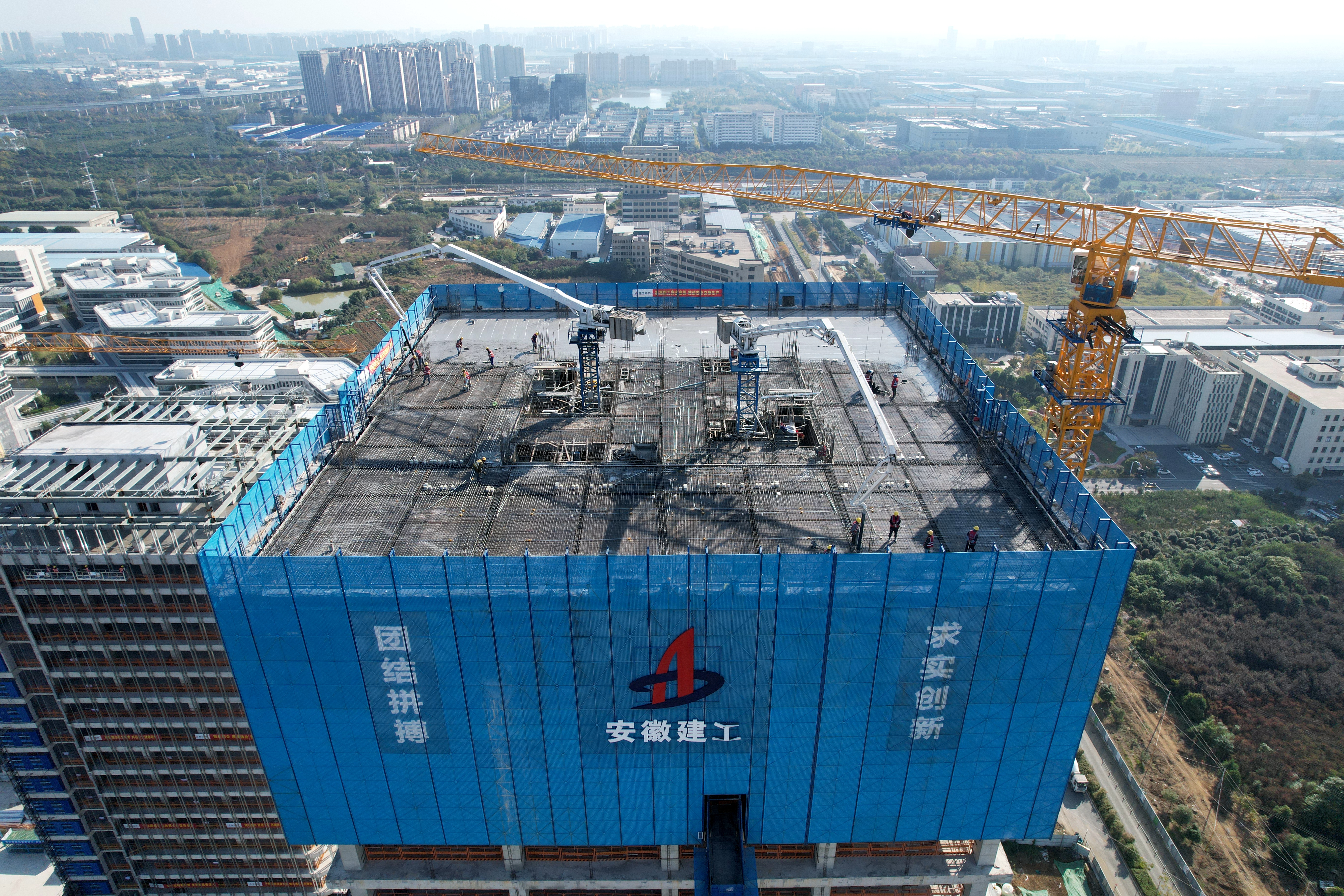 黨建與生產(chǎn)的同頻共振,不僅破解了建設(shè)難題,更催生了“1+1>2”的倍增效應(yīng)。項目黨支部緊扣項目不同建設(shè)周期的特點,精心組織開展黨員包保督導(dǎo)、任務(wù)攻關(guān)等特色活動十余次,為項目順利推進筑牢堅實保障。尤其在二期主體結(jié)構(gòu)攻堅階段,黨支部聚焦“急難險重”任務(wù),火速組建項目黨員突擊隊、設(shè)立7個黨員先鋒崗,以“越是艱險越向前”的擔(dān)當(dāng),成功攻克施工作業(yè)面廣、交叉作業(yè)密集、施工精度嚴苛等重大挑戰(zhàn),科學(xué)統(tǒng)籌工序銜接、優(yōu)化資源配置,最終創(chuàng)下地上結(jié)構(gòu)“6天/層”的施工佳績,僅用7個月實現(xiàn)主體結(jié)構(gòu)封頂,生動詮釋了黨建引領(lǐng)下的“路橋速度”與“紅色擔(dān)當(dāng)”。項目獲評2024年度安徽省重大項目建設(shè)勞動競賽二等獎等榮譽稱號。