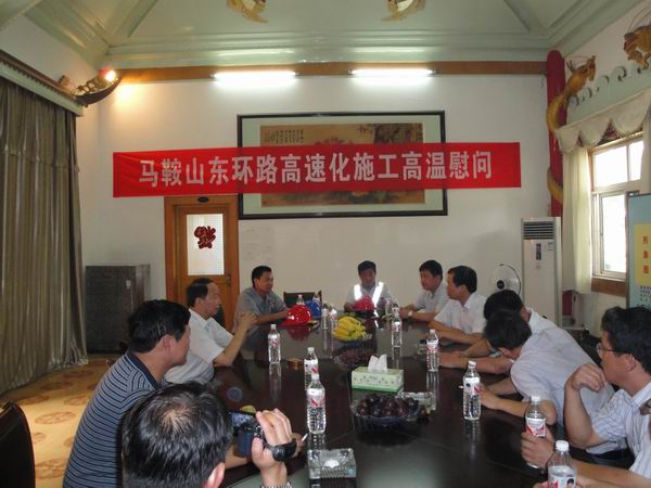 在我項目部大廳,王書記首先發(fā)表了熱情洋溢的講話,高度贊揚了我項目勇戰(zhàn)高溫、搶抓工期、誓保質(zhì)量的大無畏施工精神。隨后,王書記又送上了慰問信,并與員工代表們一一握手,發(fā)放慰問金、慰問品。最后,在項目部會議室,王書記一行與蘇指揮長,蔡主任、江主任,總監(jiān)代表郭亮以及我部項目經(jīng)理冷峰等進行座談,詳細了解了我南環(huán)02標項目的整體情況以及近期施工的進展情況,希望我部繼續(xù)發(fā)揚安徽省路橋公司攻堅克難的優(yōu)良傳統(tǒng),保質(zhì)保量的如期完成東環(huán)02標項目建設(shè)任務。