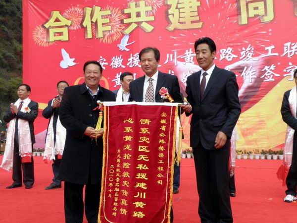 十月的松潘,金風(fēng)送爽,喜事連連。10月14日,安徽援建川黃公路竣工聯(lián)歡會暨黃山黃龍戰(zhàn)略合作簽字儀式在美麗的黃龍風(fēng)景區(qū)廣場隆重舉行。安徽省政府秘書長梁衛(wèi)國、省交通廳副廳長丁慶領(lǐng)及四川省、阿壩州、松潘縣各級領(lǐng)導(dǎo)出席儀式。我公司總經(jīng)理汪衛(wèi)東、黨委書記陳光磊以及漳黃02標(biāo)項(xiàng)目經(jīng)理陳莘同志作為特邀嘉賓出席典禮。這標(biāo)志著我安徽路橋?qū)谥г膳苏狞S公路建設(shè)任務(wù)的圓滿完成。