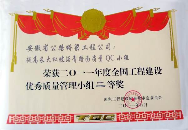 近日從杭州舉辦的2011年度全國(guó)工程建設(shè)質(zhì)量管理小組成果發(fā)布會(huì)上傳來(lái)喜訊,蕪宣養(yǎng)護(hù)項(xiàng)目QC質(zhì)量活動(dòng)小組在此次成果發(fā)布會(huì)取得驕人成績(jī),經(jīng)過(guò)最終評(píng)審,我部QC小組課題為《提高長(zhǎng)大縱坡瀝青路面質(zhì)量》的研究榮獲年度全國(guó)工程建設(shè)質(zhì)量管理小組二等獎(jiǎng)。