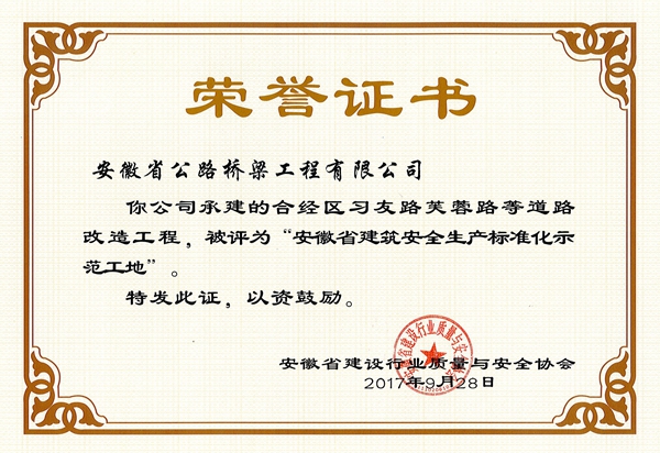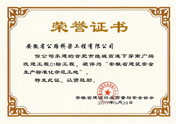 近日,從安徽省建設(shè)行業(yè)質(zhì)量與安全協(xié)會(huì)獲悉,由公司承建的合肥市繞城高速下穿南廣場(chǎng)改建工程01標(biāo)、合經(jīng)區(qū)習(xí)友路芙蓉路等道路改造工程兩個(gè)項(xiàng)目榮獲“安徽省建筑安全生產(chǎn)標(biāo)準(zhǔn)化示范工地”稱號(hào)。