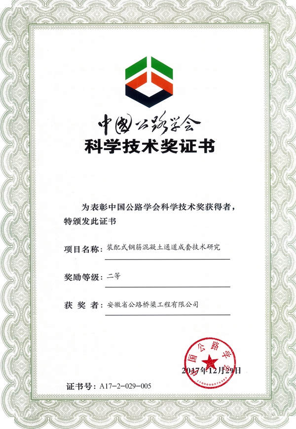 近期,“2017年度中國公路學會科學技術獎頒獎大會”在北京召開,公司選送的《裝配式鋼筋混凝土通道成套技術研究》成果榮獲二等獎。