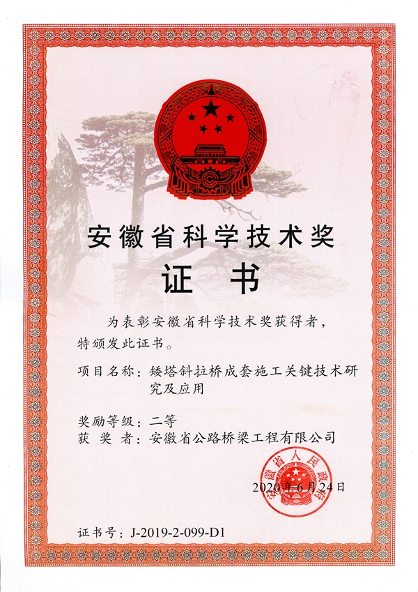 近期,公司主持申報的《矮塔斜拉橋成套施工關(guān)鍵技術(shù)研究及應(yīng)用》課題,通過層層篩選,榮獲“2019年度安徽省科學(xué)技術(shù)獎二等獎”。