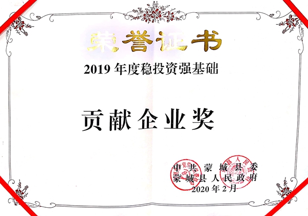 近日,蒙城縣委、縣政府印發(fā)了《關(guān)于2019年度全縣綜合考評(píng)結(jié)果的通報(bào)》文件,對(duì)2019年度對(duì)蒙城社會(huì)經(jīng)濟(jì)發(fā)展貢獻(xiàn)較大的單位進(jìn)行了表彰。公司榮獲蒙城縣穩(wěn)投資強(qiáng)基礎(chǔ)貢獻(xiàn)企業(yè)獎(jiǎng)。