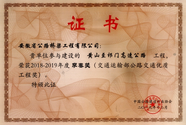近期,由中國公路建設(shè)行業(yè)協(xié)會組織的“全國公路高質(zhì)量發(fā)展云端論壇”正式落幕。期間,以網(wǎng)絡(luò)形式頒發(fā)了2018-2019年度李春獎。公司參與建設(shè)的“黃山至祁門高速公路”工程榮獲李春獎。