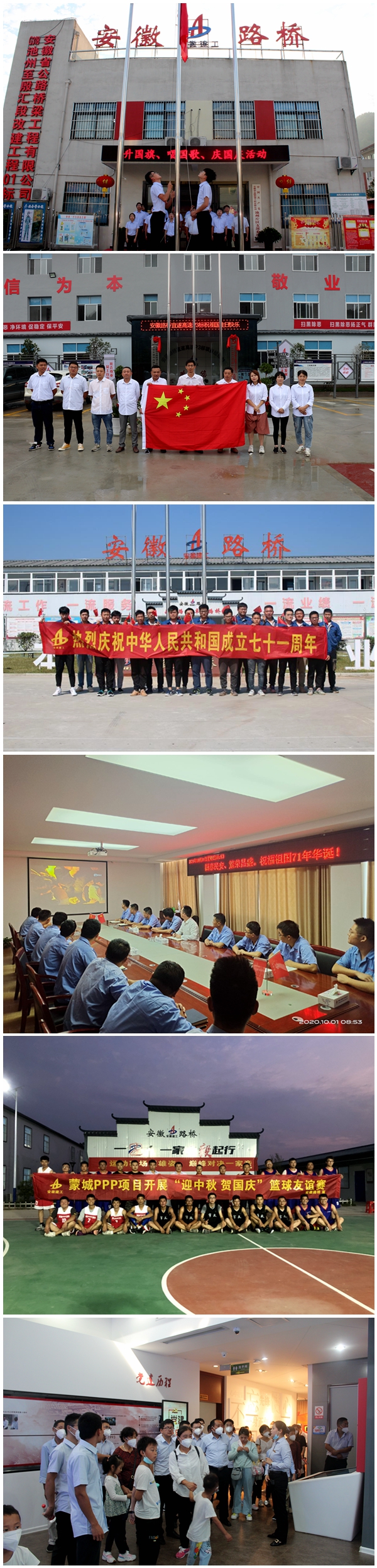 國慶前夕,市政分公司開展“學(xué)習(xí)強(qiáng)國·一站到底”迎中秋慶國慶知識競賽,以賽學(xué)史,吸引了來自十多個(gè)項(xiàng)目青年員工的積極參與。國慶當(dāng)日,福建漳州項(xiàng)目、陜西合陽項(xiàng)目、江西宜遂高速P3標(biāo)、河南黃河特大橋項(xiàng)目、固蚌02標(biāo)、徽州大道等省內(nèi)外重點(diǎn)項(xiàng)目共同舉行“升國旗、唱國歌、慶國慶”主題活動(dòng),表達(dá)對祖國母親的祝福之情。明巢高速05標(biāo)、合肥軌道4號線01標(biāo)等項(xiàng)目黨支部組織全體員工集中觀看《我和我的祖國》《建國大業(yè)》《八佰》等愛國題材電影。鳳陽ppp項(xiàng)目、廬江片區(qū)項(xiàng)目組織員工就近參觀愛國主題教育基地,接受一次深刻的理想信念和愛國主義教育。此外,池州G318改建工程、蒙城PPP、蕪黃高速等項(xiàng)目還結(jié)合“家文化”建設(shè),邀請職工家屬到項(xiàng)目部共慶佳節(jié)。