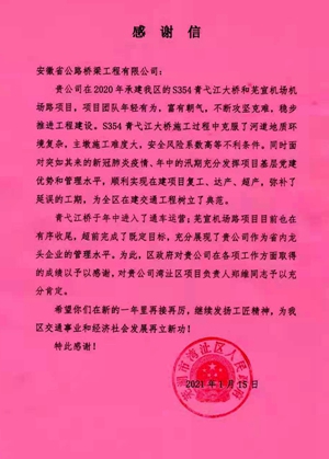 1月15日,蕪湖市灣沚區(qū)人民政府向安徽路橋公司發(fā)來感謝信,對(duì)公司順利完成青弋江橋和蕪宣機(jī)場(chǎng)路項(xiàng)目施工任務(wù)予以感謝。
