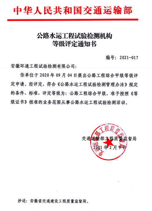 環(huán)通工程試驗(yàn)檢測(cè)有限公司順利獲批交通部公路工程綜合甲級(jí)試驗(yàn)檢測(cè)資質(zhì)