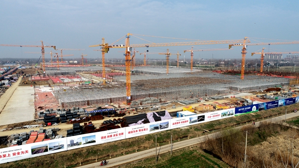 2月12日,農(nóng)歷大年初一,在舒城縣智慧電子小鎮(zhèn)EPC總承包項(xiàng)目施工現(xiàn)場,數(shù)百名工人正在進(jìn)行廠房鋼筋幫扎、支架搭設(shè)。