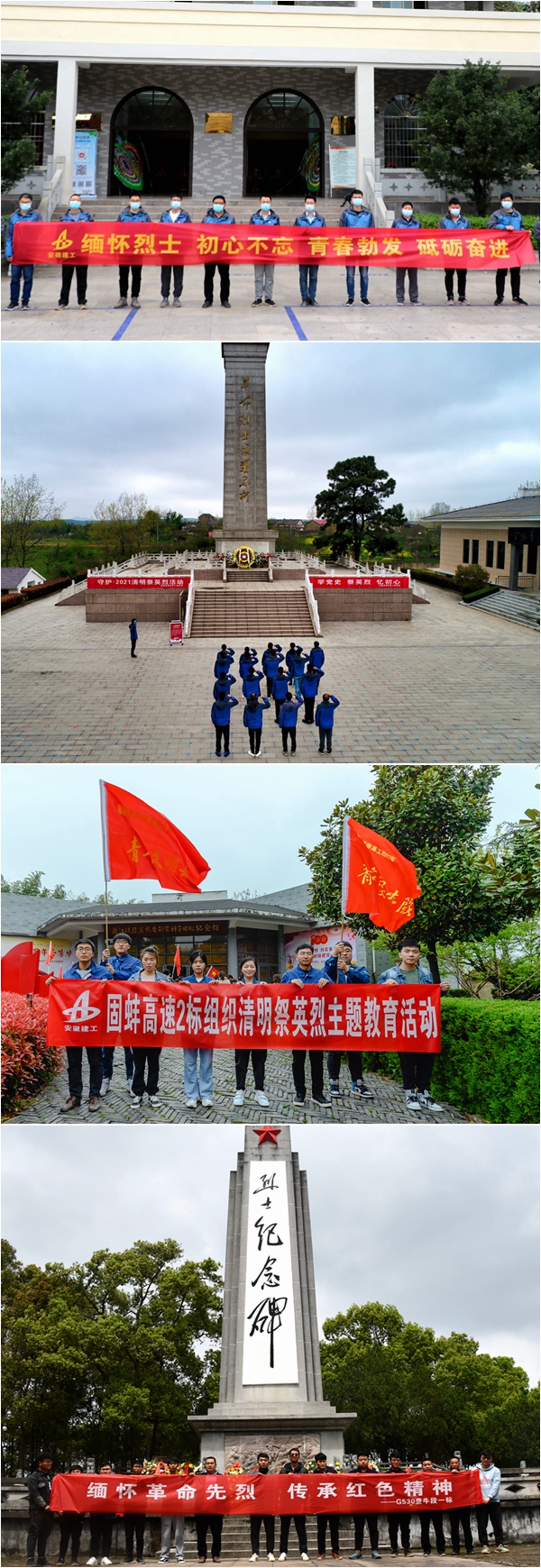 在紅色江西,公司承建的吉康改擴建C1標項目黨員及團員青年前往遂川縣革命烈士紀念館,學習革命歷史,緬懷革命先烈,了解不同時期革命烈士的先進事跡;滁河大橋項目黨支部在全椒周家崗革命烈士陵園開展“緬懷革命先烈,傳承民族精神”為主題的清明祭掃活動,向烈士紀念碑敬獻花籃,寄托哀思。固蚌高速2標項目部黨支部前往蚌埠渡江戰(zhàn)役總前委舊址紀念館參觀學習,開展以“學習黨史、不忘初心、牢記使命”為主題的教育活動; G530查橋至牛磯段一標組織員工前往東至縣烈士陵園開展“緬懷革命先烈、傳承紅色精神”清明祭掃活動;馬鞍山S247項目組織觀看《你記得我,我就活著》主題短片,學習黨史精講課程---《永不叛黨》,并積極開展研討交流。
