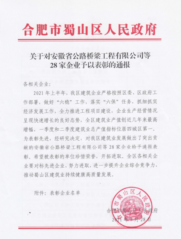 上半年,公司認(rèn)真謀劃、統(tǒng)籌部署,堅(jiān)持疫情防控和生產(chǎn)經(jīng)營(yíng)兩手抓、兩手硬,積極做好“六穩(wěn)”工作、嚴(yán)格落實(shí)“六?!比蝿?wù),企業(yè)生產(chǎn)經(jīng)營(yíng)情況始終保持增長(zhǎng)態(tài)勢(shì),為蜀山區(qū)建筑業(yè)總產(chǎn)值指標(biāo)上半年位居全市首位做出了突出貢獻(xiàn),為此,蜀山區(qū)人民政府對(duì)公司給予通報(bào)表彰。下一步,公司將珍惜榮譽(yù),緊緊圍繞“十四五”戰(zhàn)略規(guī)劃,進(jìn)一步提高競(jìng)爭(zhēng)力,持續(xù)推進(jìn)品質(zhì)路橋卓越路橋建設(shè),為推動(dòng)蜀山區(qū)建筑業(yè)高質(zhì)量發(fā)展作出新的更大貢獻(xiàn)。
