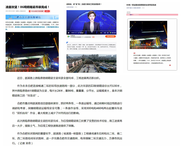 近日,人民網安徽頻道、合肥市廣播電視臺、合肥市人民政府等多家省市級主流媒體相繼報道了公司承建的郎溪路(裕溪路—明皇路)01標項目建設情況。
