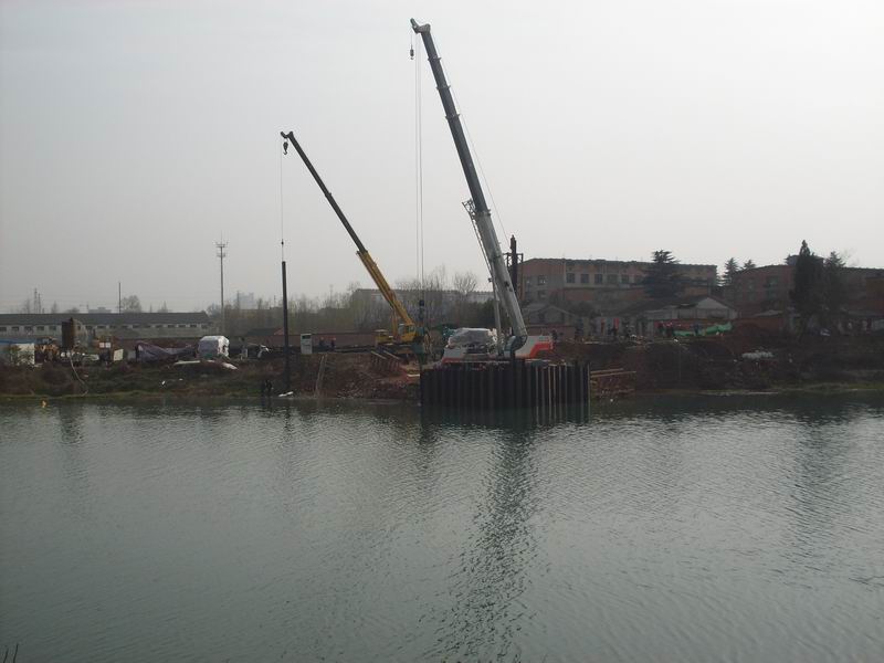 淠望路大橋作為市政工程具有工期緊、任務重、技術難度大的特點,但經項目部領導精心組織、科學部署,加大人力與設備的投入,自2月1日進場開工以來,全部90根挖孔樁已開挖41根,累計深度270m;于2月18日開始進行關鍵工序——主墩右幅鋼板樁圍堰施工。由于淠史杭干渠承擔皖豫兩省14個縣(區(qū))的春耕灌溉任務,六安市重點辦要求加快施工進度,必須在4月15日完成所有水下工程及用于水面以上施工的支撐等,并于4月25日前完成圍堰拆除清理工作。項目部立即召開緊急動員會,號召全體技術人員克服一切困難和挑戰(zhàn),堅決完成上級交代的任務,并立即組織技術人員根據鋼板樁長度、水深、地質、承臺埋置深度等情況,制定了科學的施工技術方案、成立了以項目部經理、副經理為組長的安全領導小組。施工所用的T90振動錘、70t吊車、25t吊車、PC200挖機、 T100推土機、ZLM50裝載機、自卸車等重型機械設備陸續(xù)開進施工現場。
