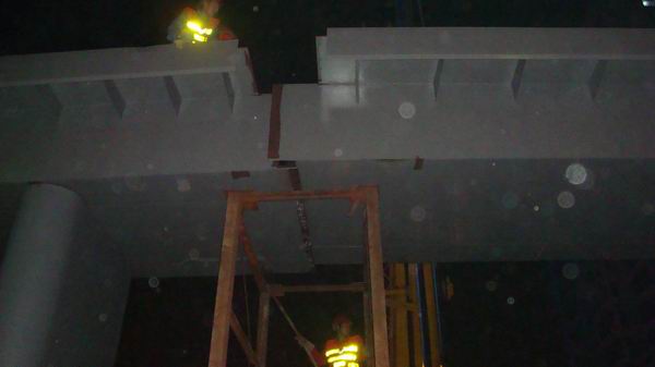 晚上21:30,運(yùn)梁車準(zhǔn)時(shí)將A梁運(yùn)達(dá)施工區(qū),隨即北一環(huán)南側(cè)在交警的協(xié)助下,按計(jì)劃全封閉。經(jīng)過近一個多小時(shí)的安裝,晚上23:00整,張洼路天橋施工區(qū)響起了一陣陣掌聲,禮炮隨后騰空燃起——A梁成功安裝了。B梁在隨后的3個小時(shí)內(nèi)也成功完成安裝。