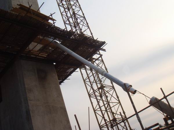 該斜拉索長19.0米,重1噸,由43根鋼絞線組成。據(jù)悉,六安淠望路大橋主塔共有斜拉索60根,由高強度、低松馳的光面鋼絞線組成。單根鋼絞線直徑為15.2mm,標(biāo)準(zhǔn)強度fpk=11860Mpa。斜拉索采用三層防護(hù):第一層涂油脂或石蠟,第二層為單根鋼絞線熱擠單層PE層,第三層整體索外包HDPE雙層護(hù)套。主塔的左、右幅索塔各布置了15對斜拉索,最大索長123.0米,重12噸,由73根鋼絞線組成。 整個斜拉索施工計劃到2010年4月份完成。